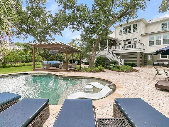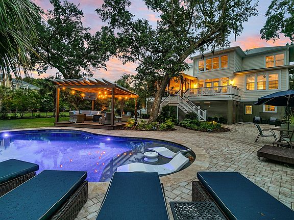 A true entertainers paradise! This home has an amazing pool, yard (.5 acres) and finished rec room on the ground level that all lends to a great Lowcountry lifestyle! A definite WOW, this elevated home with a 3 stop elevator, 4 car garage (or boat storage), massive kitchen and main level primary bedroom has all you could want! There's even a 2nd primary bedroom on the 2nd floor and includes 2nd story porch access. Features include heart pine floors, wine fridge, newer quartz counters, gas cooktop and all appliances convey, 2nd beverage fridge, expanded width driveway for overflow parking, private lot, pond sits next to and behind house. Finished Rec Room includes bar, full bath, pool table, shuffleboard, full fridge. House comes furnished (if needed) with exceptions. Roof replaced '23...... and HVAC in '24. Square footage does not include the finished garage space with a mini-split A/C. That's bonus space. Additional included items are: All mounted TV's included 85" living room, 75" primary bedroom, 2 in the flex room (65" 60"), bonus room upstairs (75") outside pergola (55"). In-wall speakers (upstairs bonus room and living room) and surround sound with high-end audio equipment/amplifiers/receivers and subwoofers. HomeKit (Apple) home automation with 50 plus accessories controls (locks, lights, TV's, garage door and more) with 12" walled mounted iPad. Home email address; the house has its own email address that is connected to all the automations, systems (pool app, sprinkler app, fridge app, home app, lights...) and accessories. Permanent exterior holiday lighting with app control and customizations. Large extra freeze in garage. Flex room videos games, pool table, shuffleboard, golden-tee, fridge and darts. All the garage custom cabinets and storage shelves. All outdoor furniture, patio, decks, pool and pergola. *The metal bar in dining room and live oak table in entry way are not included.