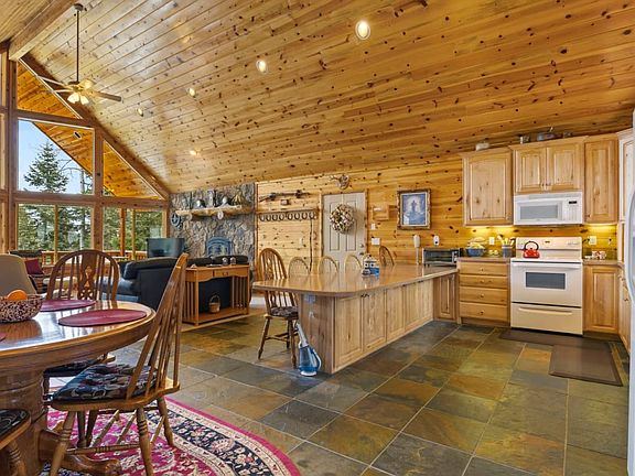Rambler log home has an open floor plan. Views of aspen & pines through wall of windows. 1st level has great room, stone wood burning fireplace, kitchen, master bed, bath with double shower & closet. Back deck provides space for grilling. Basement has 2 bedrooms, bath, stove and laundry in great room . Fire pit in backyard. Detached 520 sq' heated shop. The sound of the wind through the pines is a perfect way to unwind. Activities include ATV, snowmobile, hiking & horseback riding.