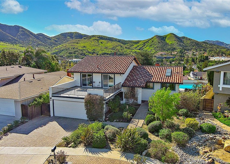 Unobstructed, near-360° mountain, canyon, and city-light views define this hilltop Spanish Mediterranean estate. Designed for elevated indoor-outdoor living with a resort-style backyard, pool, and spa. A truly special setting in one of Agoura Hills’ most desirable locations. Spanning approximately 2,500 square feet, the five-bedroom split-level layout balances openness with intimacy, accented by European engineered wood floors and travertine surfaces that ground the interiors in warmth and texture. The heart of the home is an open-concept kitchen—thoughtfully redesigned with quartz countertops, a substantial center island, Bosch appliances, a skylit ceiling with retractable shades, and refined finishes—equally suited for quiet mornings and elegant entertaining.