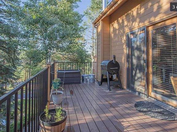 Hilltop location. Immaculate & contemporary two-story mountain unit in private setting. Stunning vaulted ceilings with custom tongue & groove cedar finishes. Sky lights, open layout & charming wood burning stove add to the warm mountain atmosphere. Spacious bedrooms with private deck on first floor. Huge west facing deck. Commute directly to downtown Denver via the RTD bus stop which is just an eight minute walk from this conveniently located property. A must see Evergreen condo!