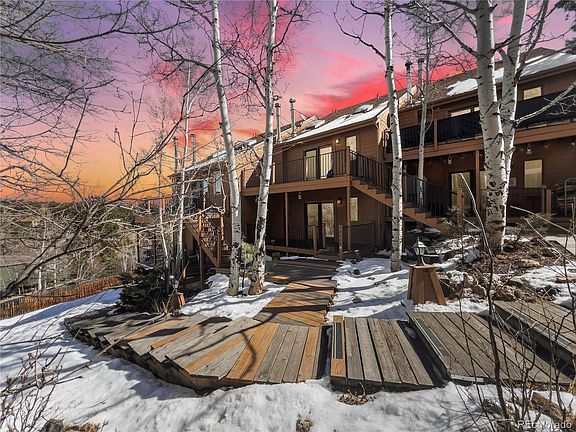 Rare opportunity to own in Evergreen at a great price with affordable HOA in a well-maintained condo tucked away in the heart of Sun Creek. The kitchen is bright and functional opening to bar, nook, and living area adorned with shiplap detailing. The wood-burning fireplace brings a delightfully rustic focal point to the room to keep you warm during picturesque Evergreen winters. The covered front patio brings a roomy + shady spot to enjoy crisp fresh air all year long and watch the sun set over Bergen Peak in summer. The most delightful feature could very well be the private balcony off the bedroom where you can sip morning coffee while watching elk nibble on raspberry bushes. Beyond its abundance of charm, this unit is comfortable and practical with a laundry area, plenty of storage, a reserved parking space and available visitor parking. The association fee is reasonable as well covering master insurance, maintenance of grounds and structures, snow removal and trash. If you’re looking to buy Evergreen you already appreciate the magic this area has to offer. At 30669L Suncreek you’ll be minutes from everything you love ... mountains, wildlife, open space, cafes, coffee shops, art galleries, golf, and Evergreen Lake. Highway 74 will whisk you back “down the hill” quickly to work and DIA. A left on I-70 will sweep you to adventures higher in the hills. Schedule a private tour today or plan a visit during open houses on Friday 3/14 from 4pm - 6pm or Sunday 3/16 from 12pm - 2pm. This is a unique opportunity. Seize it before someone else does.