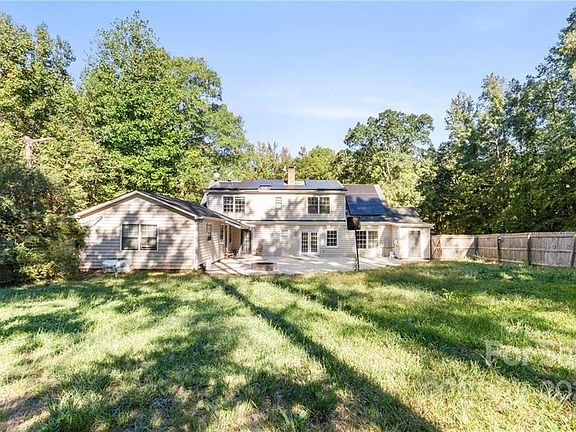 Enjoy golf course living in this beautiful home with easy access to I-77! Walk through the front door to a very spacious living room and office/bonus room area with a full wall of built ins. Main floor has kitchen with granite counter tops, stainless steel appliances and a fireplace in the dining room! Primary bedroom is downstairs with an additional one down and four more upstairs. Guest house is attached to main structure but has a separate exterior entrance (not connected interior). Guest house has own living room, kitchen, bed and full bath, perfect for an in-law suite! Walk out to the backyard and soak in the large patio with built in fire pit in your fenced in backyard. Home has plenty of storage but also includes a storage shed. Home is equipped with Solar Panels that make it very energy efficient.