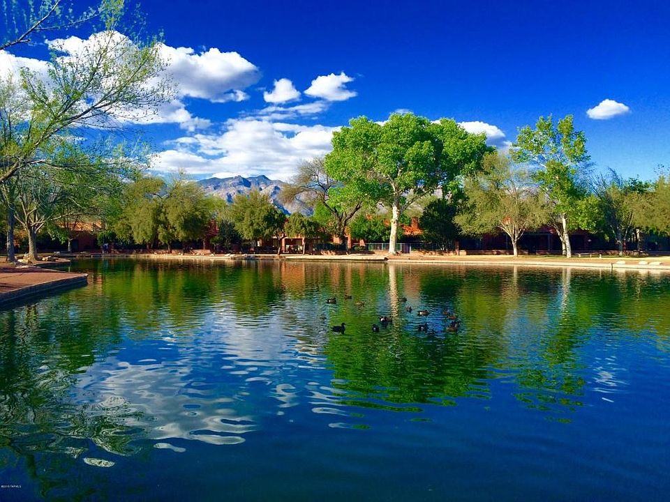 Gorgeous Energy Efficient SOLAR POWERED Contemporary 2BR/DEN, 2BA in Hill Farm Lake Community in the Ft Lowell Historic District next to The Riverwalk Loop, major shops, Tucson Medical Ctr, & miles of walking trails. Open & spacious Great Room, soaring ceilings, Updated throughout w/wood & travertine floors, new appliances, newer Trane A/C & furnace. ENERGY EFFICIENT w/utility bills of $7/month. Courtyard entry w/fountain, den w/custom built-in wall unit. Huge, lush & shady yard backs to common area is very private. HOA includes Joesler farmhouse w/accommadations for guests, Clubhouse, Pool/Spa & Lake. AVAILABLE FULLY FURNISHED.Another Diamond in the Desert.