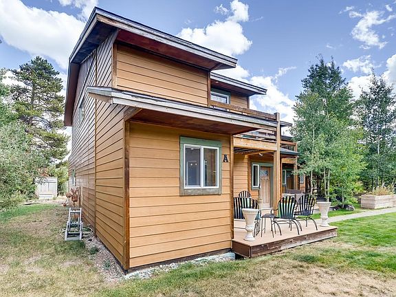 Living room spills into galley kitchen to separate dining room for fun dinner parties and snowy evenings watching Warren Miller movies. Large and bright master suite with Peak One views and a large coffee deck for Summer mornings. Cool Miners Creek home on huge lot backing into Walter Byron Park...9 minute walk to Butterhorn Bakery.