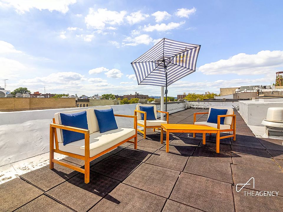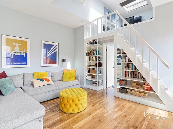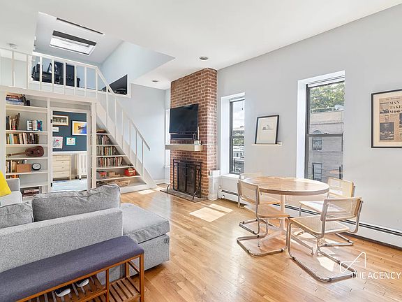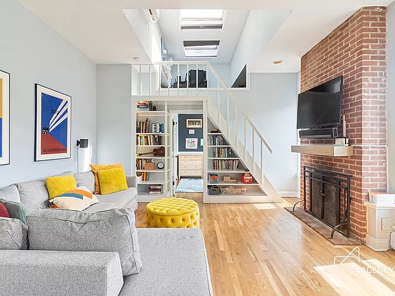 On the fourth floor of this walk-up, your bright and contemporary two-bedroom unit has a private roof deck and an additional loft space to use as an office, reading nook, or creative hobby area. The loft skylights illuminate the living room, dining room, and kitchen area and the nine southwest-facing windows ensure that all rooms are well-lit throughout the day. There is plenty of in-unit storage: ample space on both sides of the loft, a closet in each bedroom, and an entryway closet. In addition, the unit comes with dedicated storage space in the basement. Use the deeded roof space for your terrace garden or for relaxing with friends overlooking the NYC skyline and Verrazano Bridge. In the winter, you can stay cozy inside next to the exposed brick wood-burning fireplace. With additional built-in cabinets in the kitchen and dining area, hardwood floors, and a mini-split unit heating and cooling system, this lovingly updated home offers you the appeal of a great Bay Ridge neighborhood with function and style.