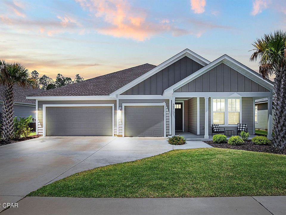 This stunning ''Heron Gold'' model in Breakfast Point is a 5BR/3BA home with modern upgrades, a large screened in patio and no neighbor to the rear. The open concept is ideal for entertaining and relaxing while the bedroom layout offers loads of privacy. The primary suite is on the far side of the home from two additional bedrooms which share a bathroom while two additional bedrooms are towards the front of the house. There are gorgeous features in the kitchen including a massive island that is great for prep work or entertaining, a subway tiled backsplash and built in appliances. There are gorgeous beams in the ceiling of the living area and primary bedroom and shiplap throughout most of the house. 307 Basin Bayou Drive also boasts a 3-car garage so you have