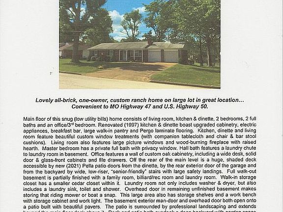 Lovely all-brick, one-owner, custom ranch home on large (.63 acre) lot in great location convenient to MO Hwy 47 and U.S Hwy 50. Full walkout basement (700 Sq. Ft. finished, 486 Sq. Ft. unfinished. More description & specifications in picture of sales flyer attached. Call Barb at 636-219-5490 for more info or to schedule a viewing.