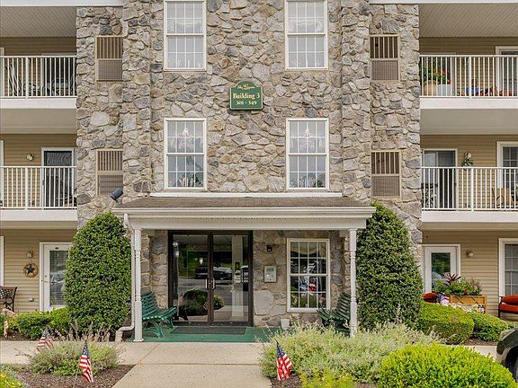 End unit on the ground level allows you to gaze out to the wooded area and stunning views of the Golf Course. The wonderful, covered patio has plenty of space to relax and enjoy nature and feel like you have your own private yard. Also enjoy these views of the beautiful backyard from your open Living room and dining area. Upgraded Anderson Storm door to patio features full-view with retractable screen. Good sized kitchen featuring stylish granite counters, new modern fan lighting fixture, newer glass top range and overhead microwave including convection oven. Two nice sized bedrooms each with large closets and windows benefited by owning a corner unit. Primary bedroom as extra linen closet. Two full bathrooms each with recently updated above sink lighting fixtures and mirrors. Hall bathroom has extra-large linen closet. New LVT floors brighten the entry, kitchen, dining area, living room and hall bathroom. Your laundry room is conveniently located just off the kitchen. HVAC was installed in 2015 and has been serviced twice a year since. This floor of Building 3 also includes a secure storage locker (8’ X 4’, see photo), plus additional garment storage space and a room for bicycle storage. Building 3 also boasts a library, social gathering room with game nights, parties and activities, and a fitness room. The Community amenities encompass a clubhouse, indoor pool, walking trails, and designated gardening area. Pets allowed with 2 cats, 1 dog, under 35 lbs restriction. This 55+ living community truly has something to offer everyone. Perfect home for a dog owner.