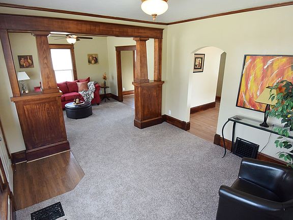 Beautiful character home in a quiet location with a fenced in yard and nice front porch. The home features a variety of natural woodwork throughout, with archways and 9-foot ceilings. Updates include new roof, windows, flooring, paint and kitchen cabinets. All three bedrooms have walk-in closets. Laundry is located on the 2nd floor in the bathroom. 1st floor bathroom is a full bath with tub. The home also features formal dining, a full basement, forced air heat, central air, a deck, and a 24x30 garage built in 2022.