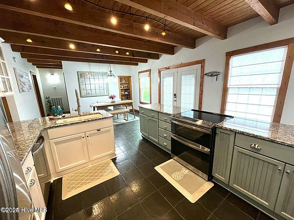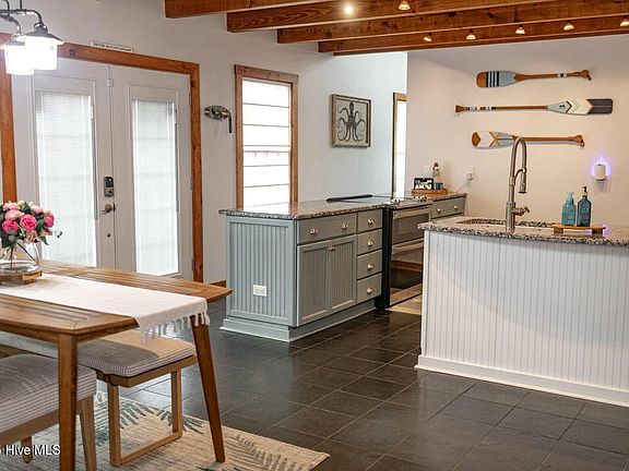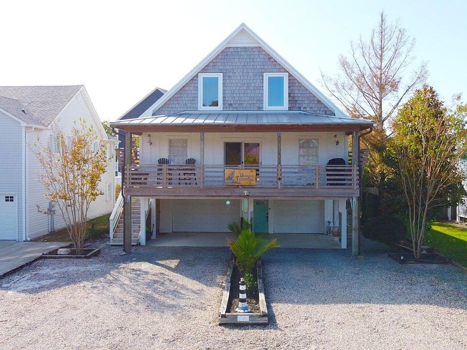 Truly One-of-Kind Home in a Sought-After Neighborhood! Nestled in the highly desirable Carolina Sands neighborhood just 3 blocks from the ocean, this stunning property features two living/family rooms, an open kitchen and dining area, 4 spacious bedrooms and 2 full bathrooms. Step inside to discover a perfect blend of timeless coastal character with modern touches for convenience including vaulted and exposed wood-beam ceilings, fresh paint, and updates throughout. Updated bathrooms, kitchen, and a huge laundry/pantry area are only some of the perks of this home. For the automotive/watersport enthusiast or someone simply wanting the perfect man cave or gym area, the 6-car garage is a standout feature! Complete with epoxied floors, a mini-split system for year-round comfort, and an electric car charging outlet, it's perfect for all your vehicles and hobbies. If all that garage space isn't enough, enjoy the luxury of a massive driveway and parking area, perfect for accommodating guests. Step outside to enjoy your fenced backyard with a retractable awning and beautiful fig trees, new exterior paint and stair cases, and a new custom expansive outdoor shower ideal for rinsing off after a day at the beach. Just 3 blocks away you'll find private beach access, along with golf cart and bike parking in the neighborhood. This home truly has it all, including a 2021 metal roof and skylights, new kitchen appliances, and new electrical panels with a generator connection for peace of mind. The community amenities are fantastic! For only $350 a year, enjoy access to the HOA pool, tennis courts, playground, and clubhouse. Plus, there's easy access to the greenway and within walking distance to a variety of restaurants. Don't miss this opportunity to make this exceptional property your own! 1 percent lender-paid closing costs with acceptable offer using preferred lender.
