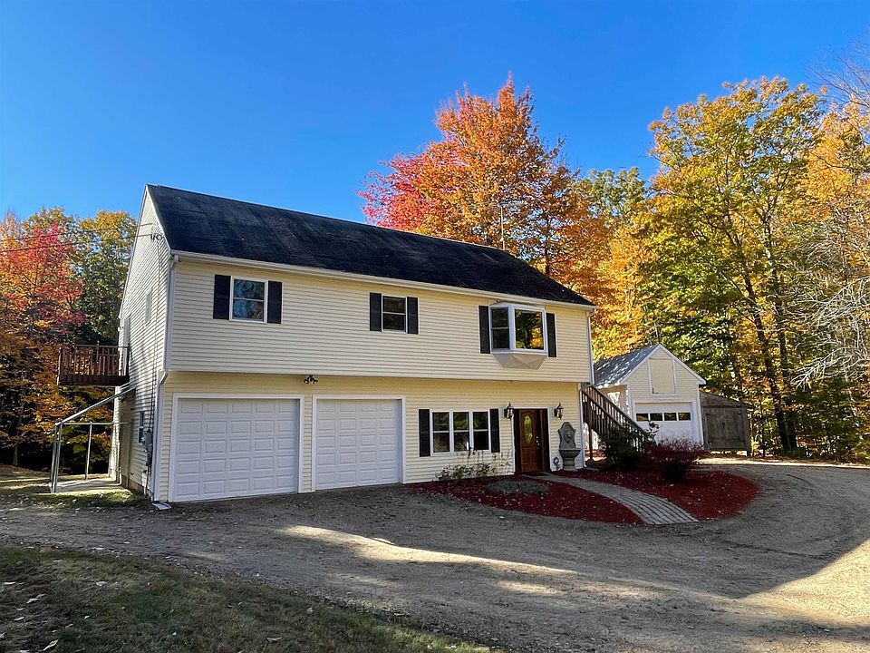 Rare opportunity to own this well maintained, 3 bedroom and 2.5 bath raised ranch over a two car garage. This property sits on 5 acres nestled between Jenness Pond and the quiet North “woods”. With both front and back yard there is ample amount of open space for entertaining, gardening, and more. There are multiple places to park and store toys of all sizes. This home includes a detached single car garage with power and storage above, a metal 24x40 garage, and the additional 2 bay garage under the house which also has radiant flooring. This home has 2 generous sized living rooms, one of which is on the second level with cathedral ceilings. Potential home office space, ½ bath in the garage area. 2nd level of the property is open and inviting as you walk into the kitchen and living room. Three great windows face the direction of Jenness Pond a short walk away. The primary bedroom includes beautiful deep skylights that adds a ton of natural light, an on suite bathroom with updated features and a private deck to enjoy coffee and the sound of loons from the nearby pond. Property meets subdividing requirements pending town approval.