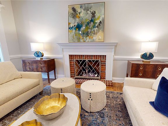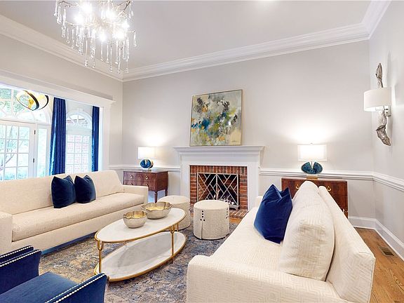 True hardwood floors grace all bedrooms, formal living spaces, and the dining room, exuding timeless charm. The spacious living room hosts a masonry fireplace with distinct gas coals, while designer sconces and an opulent chandelier elevate the formal dining experience. The four bedrooms, including the primary suite, boast custom closets and solid wood plantation shutters. The primary suite is bathed in natural light and features a jetted tub, tiled shower, double vanity, and walk-in closet.