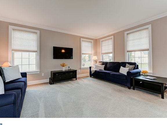 Located between Peace Valley Park and Lake Nockamixon in Bucks County this home is situated in the peaceful community of Bedminster Crossing and enjoys access to walking trails, playgrounds, athletic fields, picnic areas, and a preserved nature area. This lovely colonial style property greets you with a classic rocking chair porch and a front door with sidelight windows leads you into a main floor with 9-foot ceilings, wood floors, crown molding, and deep baseboards. Just off the foyer, the study features built-in custom shelving and is the perfect spot to curl up with a book. The great room is brightened by double-length windows, and an open floor plan leading onto the kitchen makes it a great place for entertaining. The kitchen itself has wood floors, wainscoting, recessed lighting, a double sink, and a bar for casual dining. Transom-topped rear doors lead from the kitchen to the patio and mud room/laundry room. The laundry room provides storage and counter space and allows access to the attached 2-car garage. A formal dining room and powder room complete the first floor. Upstairs the master bedroom boasts a walk-in closet and ensuite bath complete with double sink, soaking tub, glass stall shower, and display shelf. Both the second and third bedrooms have walk in closets for extra storage. The newly finished full basement contains both a family room and office with carpeting, crown molding, recessed lighting, and antique wood accents. The office, which has flexible use possibilities including a guest bedroom, also has custom built-in shelving. The yard has been professionally landscaped with new Chanticleer Pear and Sweet Gum trees and the new stone patio has a flower garden with new rose bushes and lilacs. Nestled in surrounding farmland, Bedminster Crossing is a serene community where one can enjoy evenings walking the trails or just watching the sunset from your front porch. It is within walking distance of shopping and restaurants and conveniently close to the attractions of Doylestown and the nearby parks with sailing, fishing , and other activities. The location also allows access to route 611 and the 202 expressway for easy commuting. Owner is a licensed PA Realtor.