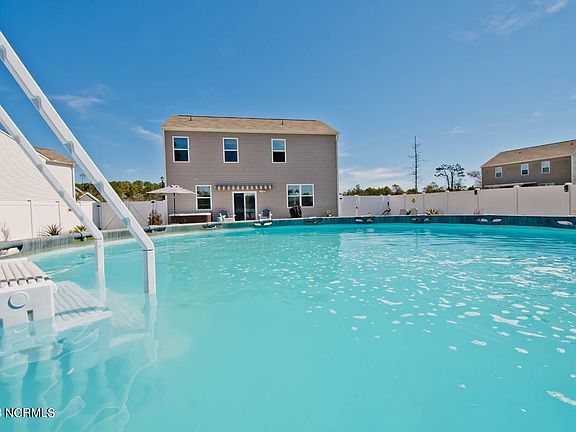 Beautiful ''like new'' 4 BR, 2 1/2 bath home in River East, western Carteret County. Built in 2020 by DR Horton, this home has been immaculately maintained with many extras added by the current owners. Above ground pool and hot tub out back, (owner added additional concrete pad for hot tub and added decking over the concrete patio) with electric retractable awning over patio, cabana out by pool, white vinyl privacy fencing in backyard with double gates on one side, lots of landscaping plantings, with palm trees and blooming shrubs, extra concrete parking added to driveway for boat/RV parking space.