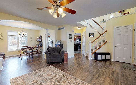 This home offers a floor plan that is incredibly well thought out, along with some tremendous upgrades. A bright, open two-story entry greets visitors at the front door. Recently installed luxury vinyl plank wood floors run from the foyer through the foyer, living room, and dining room. The kitchen features cherry cabinets, an eight-foot island, a recently installed backsplash, and a full complement of upscale stainless steel appliances. Upgraded Pella French doors with integrated blinds open onto the back patio. The 2nd floor features brand new carpet (installed Feb. 2019) throughout. The three bedrooms are all generously sized, offer multiple windows, and have ceiling fans. Two of the three bedrooms have cathedral ceilings. The master bath features recently upgraded flooring and subway tiled walls & shower. The full basement was upgraded to 9' depth. Currently used for storage, exercise & theater, it offers an egress window & bath rough-in for future 4th bedroom & 3rd full bath!