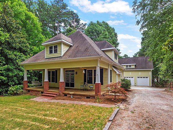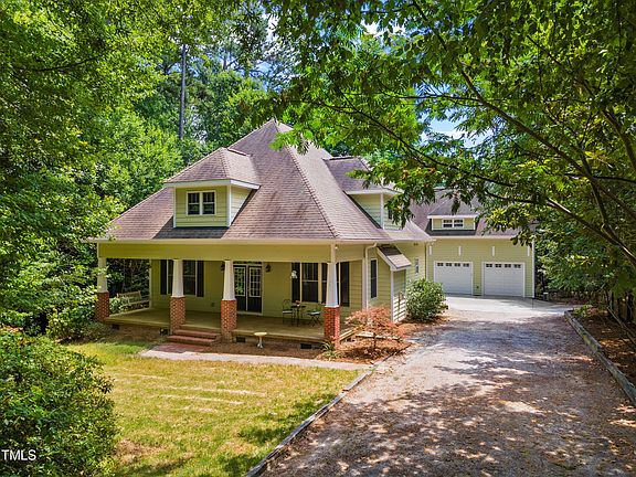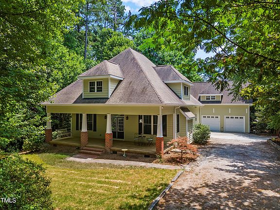 Custom home close to Downtown Cary, Fenton and Epic Games/40/440! Huge front porch set back in private wooded yard! Whole home with hardwood flooring and beautiful moulding. 2 fireplaces! Primary bedroom on main level with fireplace. House is pre-wired for a generator, never hooked up with one but pre-wired. Detached garage has full bathroom on main level. Has one side with a lifted ceiling and electric capability for a mechanics' lift. Original builder built with that intent in mind. Current owners didn't add or finish any car modification areas to garage. Owner finished with permit second floor of garage by Town of Cary it is permitted as conditioned storage. In the home, one could live on the main level with family room, primary bedroom, kitchen, eat-in area and laundry all on main floor! Speakers built in home. Gorgeous banister and wood stairs! Fridge, washer and dryer convey as is and at no value. Three bedrooms and two full baths on second floor with bonus loft area! Bedroom on second floor with private bath for second primary bedroom use. Custom wood moulding in the WHOLE HOME! Storage shed in front of home is sold as is and the previous owner ran electric to it with no permit, it is still the same. Being sold with no permit to storage shed. Connected to city water and sewer, but lot has a septic to pump to top of lot to city sewer system. Finished square footage in upstairs garage is 644 sq ft. Upstairs heating/cooling unit in home is newer! Current owners use to train in martial arts, excellent with full bath on mail level of garage. I see a place where new owner can have home gym, dance studio for personal use. Detached home office for privacy Film videos for fun or work? GREAT location!!! Endless possibilities!!