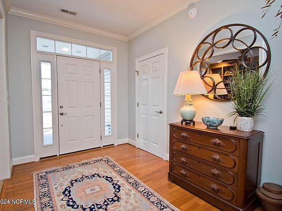 Located in a gated water access community on a cul de sac lot, this spacious custom home is situated overlooking a community pond, offering serene views from the deck. It boasts a cozy atmosphere & versatile spaces that cater to both work & family time. Upon entering through the welcoming covered front porch, there is an office located off the foyer. It features built-in bookcases, providing a private & comfortable workspace. Continuing from the foyer, you step into the great room, which showcases a gas log fireplace & offers picturesque views of the screened porch and open deck that overlooks the pond. The kitchen & dining area seamlessly connect to the great room, creating an ideal layout for easy entertaining & socializing. The functional kitchen has a pantry closet, ample cabinets, & adjacent laundry/ mudroom that enters from the garage.