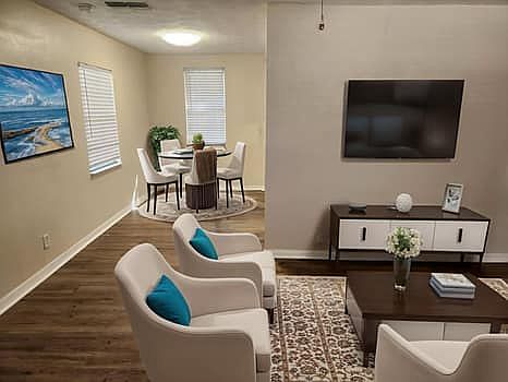 - Exterior features: Furniture is staged, large yard.sits on dead end street.Close to schools and downtown