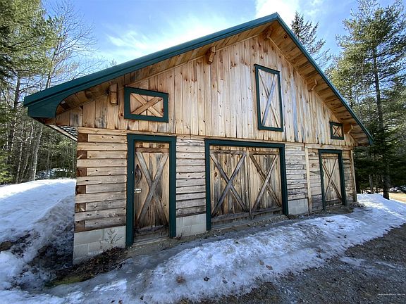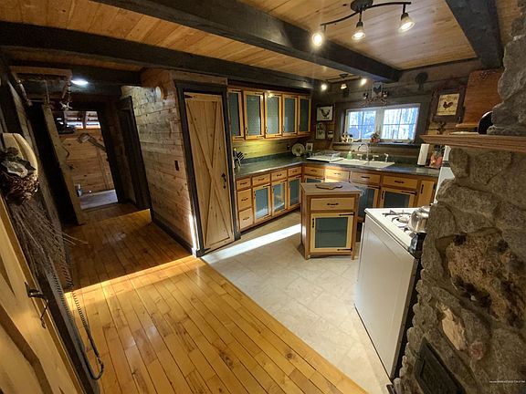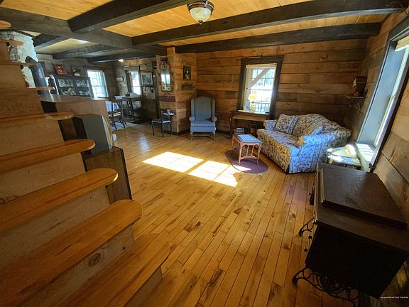 Custom 32' x 28' off-grid, cape-style log home with 3 bedrooms and one bath on 24 private wooded acres in ANDOVER MAINE. Offers gravity fed well with propane water heater - no power needed for hot showers. Heats with a wall mounted propane heat stove and an Old Mill woodstove on 2.5 cord of wood per year. First floor bedroom, custom cabinetry, pantry, hardwood floors, cedar closets and covered porches on the front and back of the home. Gorgeous center chimney built with local stones and inlaid with Maine gems and minerals. 16' x 20' outbuilding with water and power for the animals or a work shop. 28' x 30' two-story log garage with plenty of storage above. Custom quality throughout.