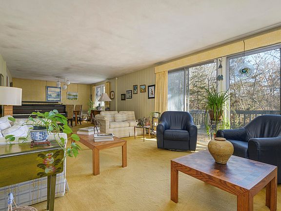 Comfortable one floor living in this 2 bedroom, 2 bath ranch with 2 car garage located in much desired Holly Point area, with a peek at the lake which is across the street. Large 35 x 13 living room/dining room combination with sliders to deck; kitchen also has deck off it, plus a gracious den with fireplace, and 2 bedrooms, including primary bedroom with private bath. Forced hot water heat, with separate central air. Two car garage under, and rights to association beach and tennis if you join the Holly Point Association. 200 initiation fee, then dues are 100 annually. If you rent the property and you want your tenants to use the beach and the tennis courts, the dues are 250 a year. Taxes may vary due to owner use of property; buyer should confirm.