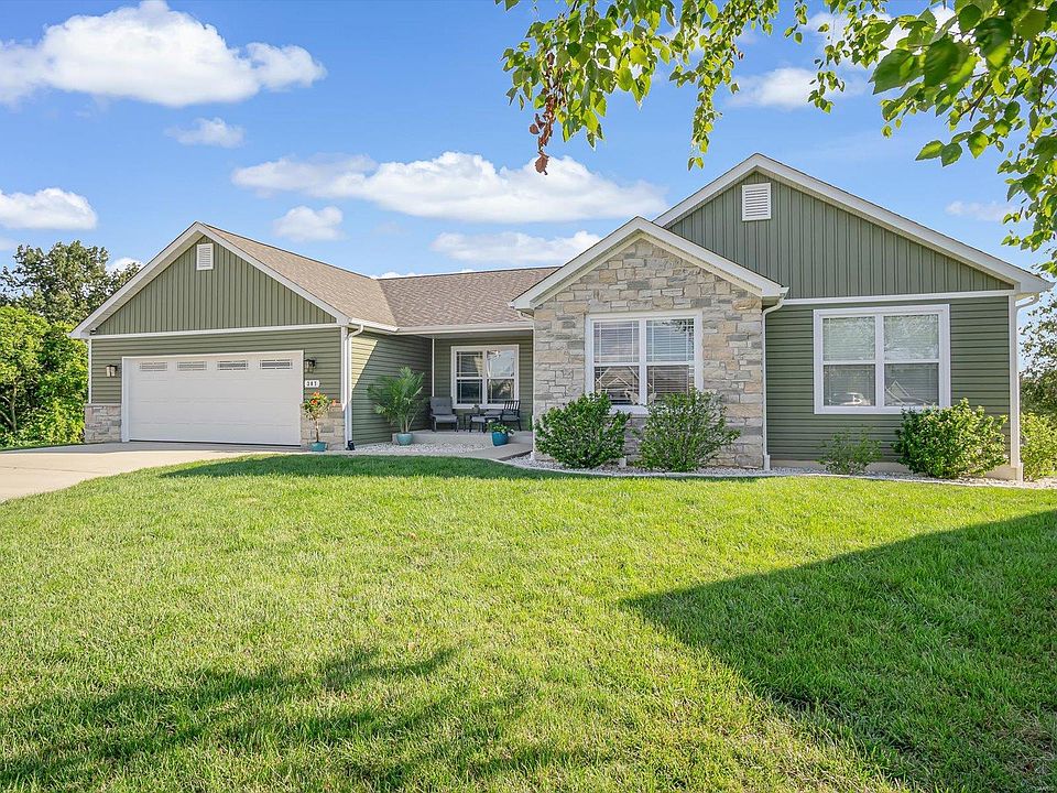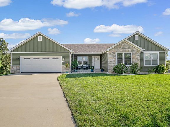 Welcome to your dream home in Waterloo, IL! This stunning one-story ranch features sage green siding and elegant stone accents. The main floor boasts four bedrooms, including a luxurious primary suite featuring new tile, double vanity, soak tub, and abundant natural light. The dreamy kitchen offers white cabinets, granite countertops, a center island with a wine fridge and microwave, newer stainless steel appliances, and a large walk-in pantry. A drop zone leads to the oversized, finished, and heated two-car garage with a bump out and TV. The covered back deck features a drop down TV, perfect for entertaining. The finished basement includes a bedroom, luxury bathroom, and an industrial-inspired living room with a bar area, sink, dishwasher, and refrigerator. The basement walks out to a fenced-in backyard. There's also an unfinished flex space, safe room, and storage area with a tankless water heater. This beautiful lot backs up to trees and offers stunning sunsets in the evenings!
