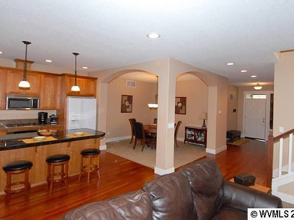 Beautiful newer home in South Salem. Welcoming entry, flowing floor plan featuring great room with corner gas FP will be the center of your entertaining. Stunning island kitchen with breakfast bar, huge walk-in pantry, and adjoins formal dining room. Main floor den/office with French door entry could be converted into a 5th bedroom. Large master suite with dual vanity, large soaking tube. Huge family/rec room. Unique treed back yard with cement patio and seasonal creek.Attached 3-car tandem garage.