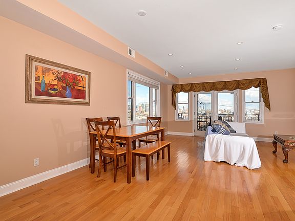 Enjoy incredible views of Manhattan in this large 3 bedroom 2 bath apt with over 1500 sq ft. Chefs kitchen features granite counters, SS appliances and custom cabinets. Private balcony with direct NYC views located short distance to elevator at the 9th St lightrail in Hoboken. 2 parking spots included.