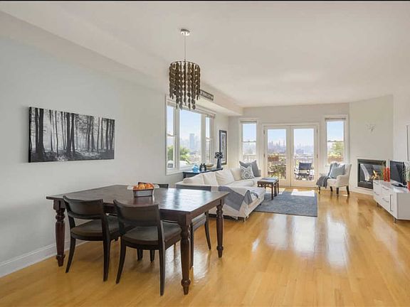 Sunny, light-filled 3 bedroom/2 bath spacious condo with direct Manhattan views sits on the Palisade cliff in Union City/"Hoboken West". Over 1500 sq. ft. features open concept living/dining space and kitchen w/ stainless appliances and breakfast bar. Enjoy direct views of NYC from the North, East, and South all day long with a terrace off the living room for fresh air and relaxation. Modern gas fireplace and hardwood floors complete the space. Large full size pantry room off the kitchen, W/D room and loads of closet space makes this modern unit feel like a home. The bedrooms nestled in the back portion offer two equally sized bedrooms plus a generous main bedroom which easily fits a king sized bed. Complimented by a spa-like European bathroom en suite and another huge closet completes this serene space. Two tandem parking spots so no need to look for parking again! Large bonus 400 sq. ft private, locked storage area in the basement, an area for bikes and sporting equipment. This unit is located on a dead end street w/ little traffic and easy access to NYC with bus just blks away. The lovely renovated Washington Park with blooming gardens and updated dog run are just outside your door. Very private and unbelievably quiet oasis! Don't miss this golden opportunity!