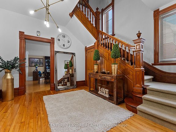 Step into timeless elegance with this magnificent 3-storey Victorian brick manor, nestled on one of Centre Town Pembroke's most charming tree-lined streets. This architectural gem blends historic charm, refined craftsmanship, and spacious luxury, offering an inviting sanctuary filled with warmth and character. Step unto a grand, sweeping front porch adorned with original ornate woodwork and a stately decorative glass wood door that sets an entrance into exquisite details found within. Inside, you'll find soaring ceilings, intricate hardwood floors, and remarkable woodwork that echo the grace of Victorian decor. The third level features two spacious bedrooms, a flexible storage room, and a stunning 4-piece bath with a clawfoot tub and ceiling skylight perfect for unwinding in vintage luxury. On the second floor, three bright bedrooms await, including a lavish master suite complete with a spa-inspired 4-piece ensuite and walk-in closet. Stained-glass windows add a touch of artistry and romance, casting rich color and light throughout the home. Enjoy modern convenience of a laundry suite adjacent to a powder room and a second 4-piece ensuite bath with lots of wood cabinetry for opulent comfort. The main level is both grand and welcoming, offering a formal dining room with generous windows, a commodious family room and an elegant grand living room. The gourmet eat-in kitchen features solid wood cabinetry, granite countertops, and opens into a cozy four-season sunroom with a charming wood stove. Step outside to your own private garden paradise with lush perennials, privacy hedges, and an in-ground sprinkler system for easy maintenance. The lower level is equally impressive, featuring workshop area, a handcrafted stone wine cellar, a serene sauna, a 3-piece bath, and abundant storage. Heated by an updated natural gas boiler, this one-of-a-kind residence offers rare character, luxury, and lasting comfort. 24 hour irrevocable required on all offers