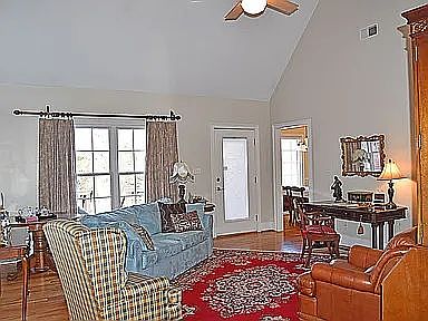 - Great room with a lovely gas log fireplace with a vaulted ceiling and access to the deck that overlooks a fenced back yard.