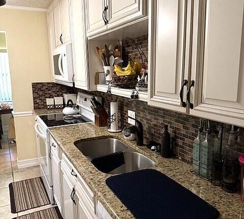 Beautifully updated 1 owner CBS home w/Tile floors throughout, AC system 2020, Roof 2023, Accordion Shutters on all windows, including front door, crown molding, chair rails in different areas, textured walls. Updated Kitchen w/42'' cabinets, granite counters, w/matching back splash, & newer appliances. Laundry closet w/stack Full size Washer/Dryer. Family room features: formal dining area, snack bar w/granite counter, Slider to Screened patio, both baths feature newer sinks/vanities/granite counter, walk-in showers, mirrored medicine cabinets, & ADA type toilets. Security w/wired cameras in and out + the ring doorbell system. Ceder lined closets w/professional shelving. Sprinkler system w/well water. Extended side yard w/metal shed + fenced rear yard. Great home for this price so HURRY!