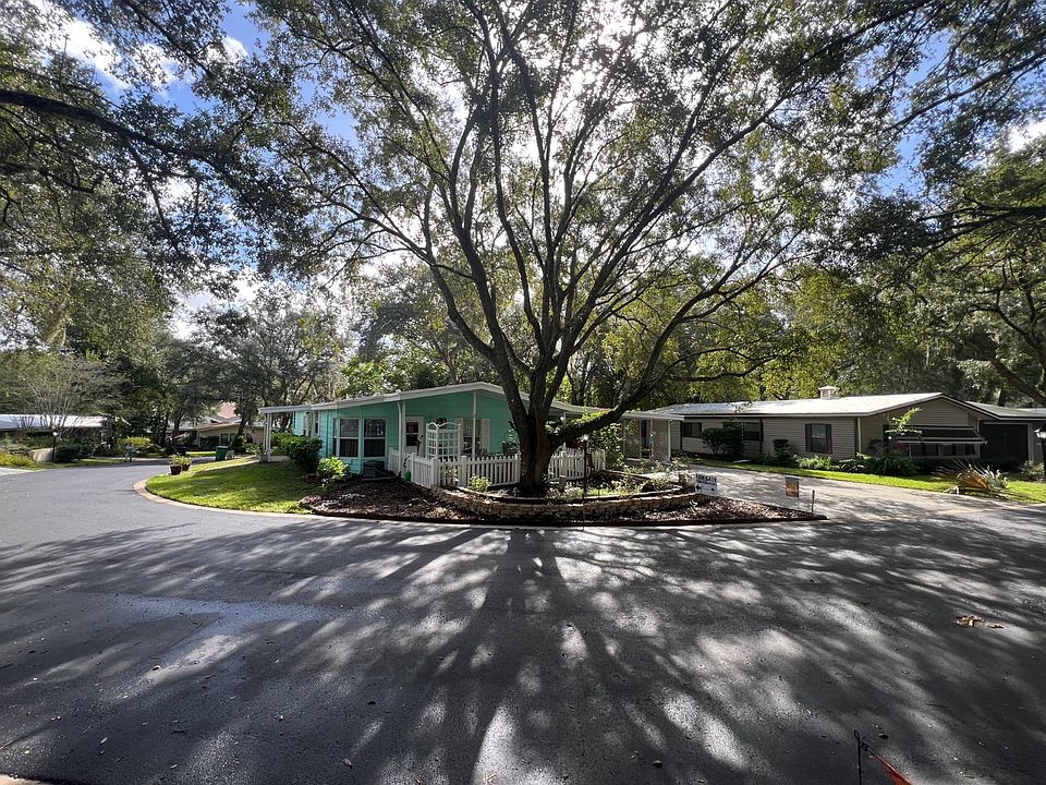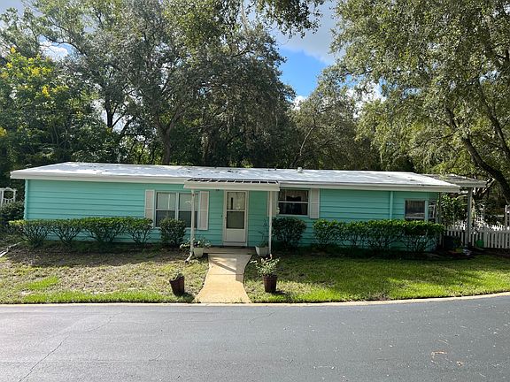 Located in The Oaks - Premier 55+ Community. This bright and happy 1988 Homes of Merit offers 3 bedrooms, 2 bathrooms, and plenty of charm. The vibrant blue exterior and lush, plant-filled yard make it feel like sunshine every day. Inside, enjoy 1,568 sq ft of living space, including a glassed-in Florida room with AC and heat-perfect for year-round relaxation. A 2-car carport adds convenience, and the layout is both cozy and functional. Home is already pre-set with a backup generator. Community & Lot Details- Lot rent: $878/month and Includes: Overnight security, Irrigation water (non-potable), high speed Fiber optic internet, 125 + DirecTV streaming channels and access to all The Oaks amenities - including clubhouse, pool & Jacuzzi, fitness center, tennis courts. Come fall in love with The Oaks lifestyle-easy, vibrant, and full of heart.