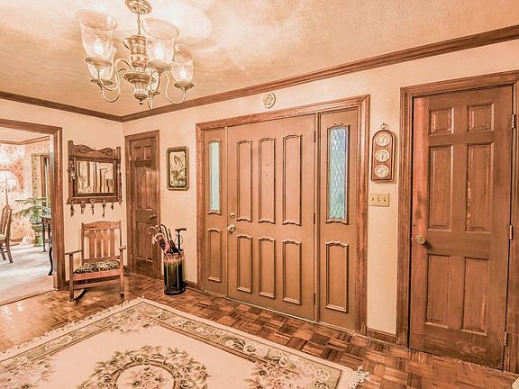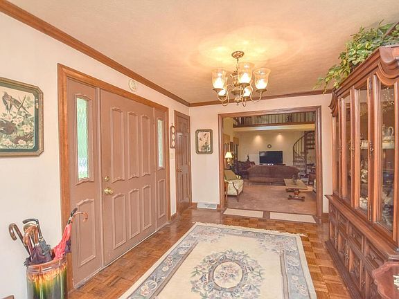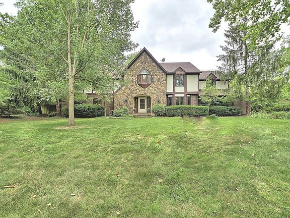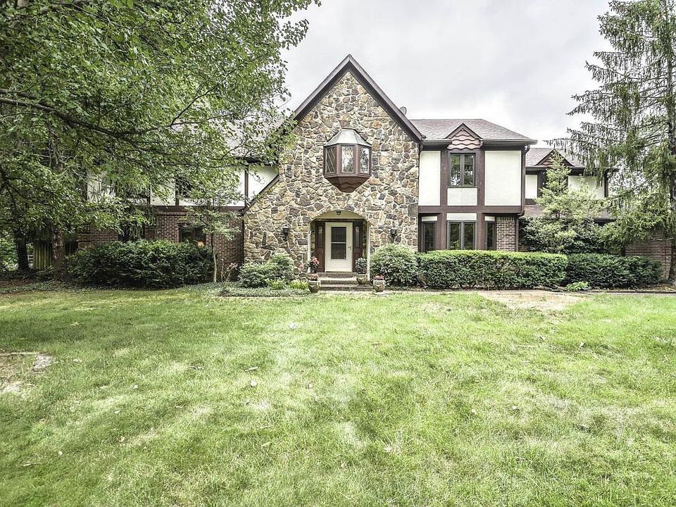 Large Country Tudor on lush landscaped acre backs up to Long Run Park. Eat-it kitchen with all appliances remaining including washer and dryer. Many updates include new Trane HVAC system in upper level 2016, new 30 yr dimensional roof 2016, gutter guard 2015, exterior painted 2015. Seller has replaced windows (Pella and Gilkey) in upper Master bedroom sitting area, two bedrooms, dining room, family room on first floor. Laundry room on first floor has sink and ceramic flooring and door to glassed porch area. Porch is heated and cooled with wall unit. Home has Dual HVAC (Bryant & Trane units). 80 gallon water heater for plenty of hot water. Finished family room in basement with bar and refrigerator remains. Cub Cadet riding tractor, 2 wheelbarrows and some yard equipment can remain.