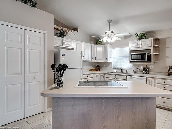 Welcome to Lake Damon Villas South!! Beautifully landscaped, decorative driveway and concrete curbing that makes this home desirable the moment you see it. This is a very well maintained home that offers an open floor plan, cathedral ceilings, spacious master suite, large shower and walk-in closet. Guest bedroom is on the opposite side of the home with a complete private bathroom. Antique finished kitchen cabinets, large pantry and an island that opens into the 19x16 living room and dining area. Lighted shelving, updated tiled flooring with sliders that open into the lanai. New roof 2018, AC 2017. There is a golf cart available to purchase. This community has a low monthly fee that includes use of the solar-heated community pool, clubhouse and there is a path to River Greens Golf Course. Come and take a peek!!