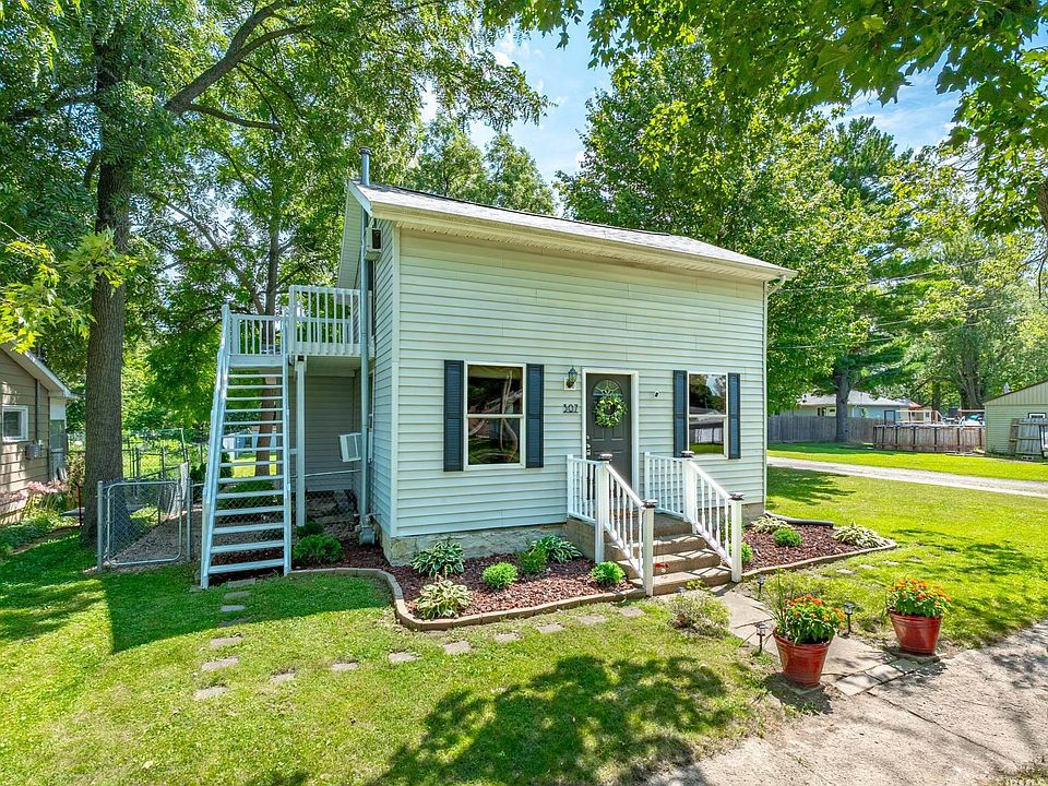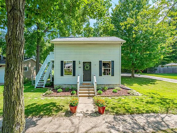 This cute, updated home on a corner lot offers a good-sized fenced yard and all the charm you could want! Located within walking distance to the many amenities the sweet Town of Pierceton has to offer—shopping, schools, playgrounds, and restaurants—you’ll love the convenience of sidewalks and off-street parking. Inside, a welcoming color palette draws you into the living room, where large windows fill the space with light. The kitchen boasts vaulted ceilings, abundant cabinetry, and windows with peaceful backyard views. The full bathroom, complete with a storage closet, sits just off the kitchen, while the main-level laundry room adds everyday convenience. A charming spiral staircase leads to two bedrooms upstairs—the larger featuring its own private balcony, great for reading or enjoying a peaceful evening. Outside, the yard provides space to play, garden, or relax under the shade of beautiful trees. Here, you can enjoy a wonderful balance of indoor comfort and outdoor living—all at an affordable price with low taxes.