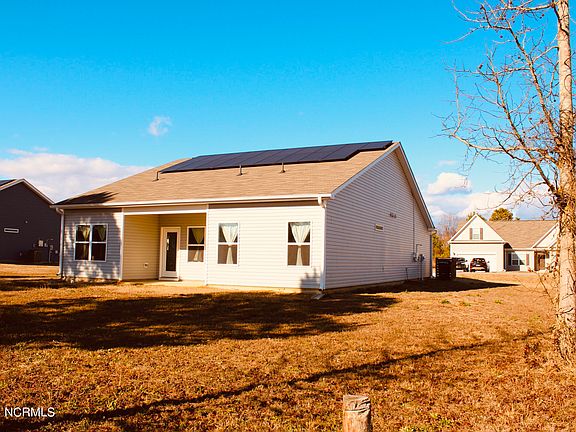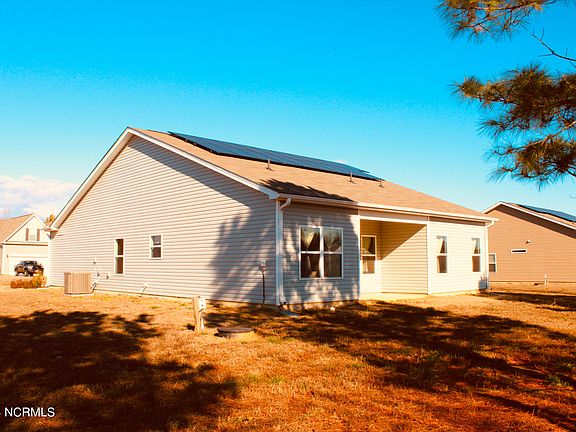 LIKE NEW home DESIRABLE neighborhood. Enjoy immediate savings of ACTIVE SOLAR PANELS without the hefty $35K price tag. Since March 2023, Duke Energy bills have averaged $24.50 per month. 3 bed 2 bath open floor plan features HUGE kitchen with Extra-Large Island, tons of cabinets and countertop space. Open living, dining, and kitchen with lots of natural light. MASSIVE Master suite with room for a sitting area which features relaxing en-suite with separate shower and garden tub, toilet closet, and double vanity. EXTRA LARGE walk in closet with tons of storage space. Entertain on the EXPANDED patio. Wall to wall painted 2 car garage. ADDED BONUSES: Newer Fridge, Washer, and Dryer to convey. Northeast, Norwayne, and CBA schools, easy commute to Seymour Johnson AFB!