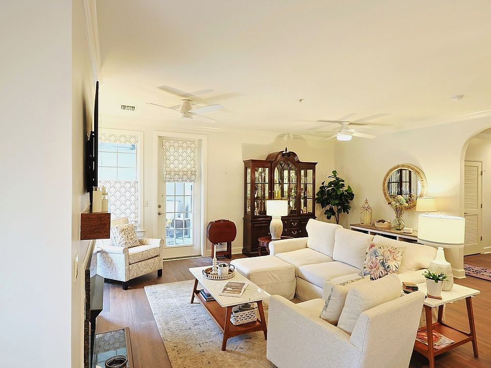 Inside, you’ll find thoughtful upgrades throughout: high ceilings, fresh paint, new trim and baseboards, upgraded lighting and fans, no carpet, and all-new smart appliances. The open kitchen flows seamlessly into the dining and living areas—perfect for cozy evenings or entertaining friends. Presently the homeowner is utilizing the 3rd bedroom as a formal dining room. Step outside to your private balcony and take in the lush courtyard and sparkling pool below.
