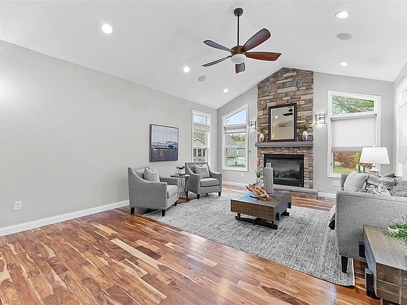 Welcome to this charming ranch in Wentzville! You'll appreciate this newer home with its beautiful hardwood flooring, vaulted ceilings, and rounded corners throughout. The impressive great room features soaring ceilings, a stone gas fireplace, and recessed lighting - making it a perfect gathering space. The kitchen is a chef's dream, boasting stainless steel appliances, 42" wood cabinets, a pantry, ample counter space, and a breakfast bar. Your primary bedroom suite will be a peaceful retreat, complete with vaulted ceilings, walk-in closet, a jetted tub, and a separate shower. Wired for a whole house speaker system, you'll enjoy cranking up the tunes - even in the backyard and garage. The unfinished lower level has a bathroom rough-in and an egress window - making it a great space for other bedroom or recreation space. Remember to check out the spacious fenced in backyard and finished garage.