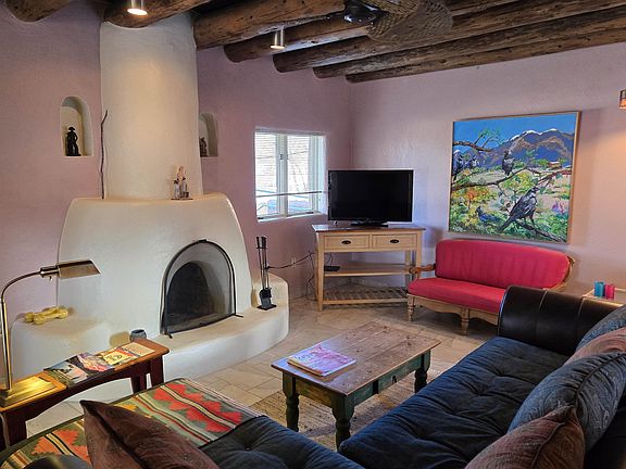 This beautifully updated 2 bedroom 2 bath condo is just a short walk to downtown Taos. It features 2 separate courtyards, a one car garage, a big kitchen island, stainless appliances and ensuite bathrooms for each of the bedrooms. There is a full sized washer and dryer in the unit. The building has 6 units. Valverde Street is located just 2 blocks west of Taos Plaza and is very convenient to shopping, restaurants, concerts and downtown events. PRIME LOCATION AND COMMUNITY FEATURES: The condominium, called Casa Grande is ideally located within the historic district of Taos, an area where short-term rentals are not permitted; however, long-term rental opportunities are available for residents. Its prime placement offers outstanding convenience and walkability as it is situated close to the plaza, Kit Carson Park, the dog park, and the library. Being on the north side of the Historic Taos Plaza, the property provides easy access to the Taos Ski Valley, making it especially appealing to those who enjoy outdoor activities. Additionally, the building borders Garcia Elementary School, ensuring a peaceful and quiet atmosphere during evenings, summers, and weekends. OPEN LIVING SPACES AND COURTYARDS: The main living area of the condominium is designed with an open-concept kitchen and living room. French doors in the living area open directly onto the east courtyard, which leads to the back condo area and serves as a shortcut to the plaza. A fireplace, crafted by renowned Taos artist Carmen Valvarde, serves as a striking centerpiece in this space. The kitchen is equipped with modern stainless steel appliances, including an electric range with an internal exhaust system. It overlooks the south courtyard, which provides passive heat in the winter to keep heating costs low and helps keep the unit cool during the summer. The south courtyard also features a flagstone patio and connects to the condo grounds, the front parking lot, and the pathway to the plaza. BEDROOMS AND BATHROOMS: Both bedrooms in the unit feature custom-designed headboards created by a local artist and have their own individual thermostats for personalized comfort. The master bedroom has a sliding door that opens directly to the courtyard and includes a private bathroom with a shower. The guest bedroom contains a full-size washer and dryer neatly tucked away in a closet, and the guest bathroom is accessible from the main living area, providing convenience for both residents and guests. The entire unit is finished with tile flooring throughout. HEATING, GARAGE AND BUILDING DETAILS: Heating for the condo is provided by water baseboards, with the boiler and hot water holding tank located in the one-car garage beneath the unit. This setup ensures that the garage remains heated during the winter months. The garage is equipped with a smart door that can be controlled via an app. While the garage does not have direct access to the living space, stairs lead from the garage to the entryway, and once inside, all living areas are situated on a single level for ease of access. The building itself consists of six units, was re-stuccoed in 2018, and had its roof and stairs replaced in 2021, with both improvements currently under warranty. Most furnishings can stay with the unit. Seller intends to retain artwork and selected pieces.