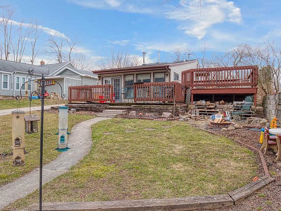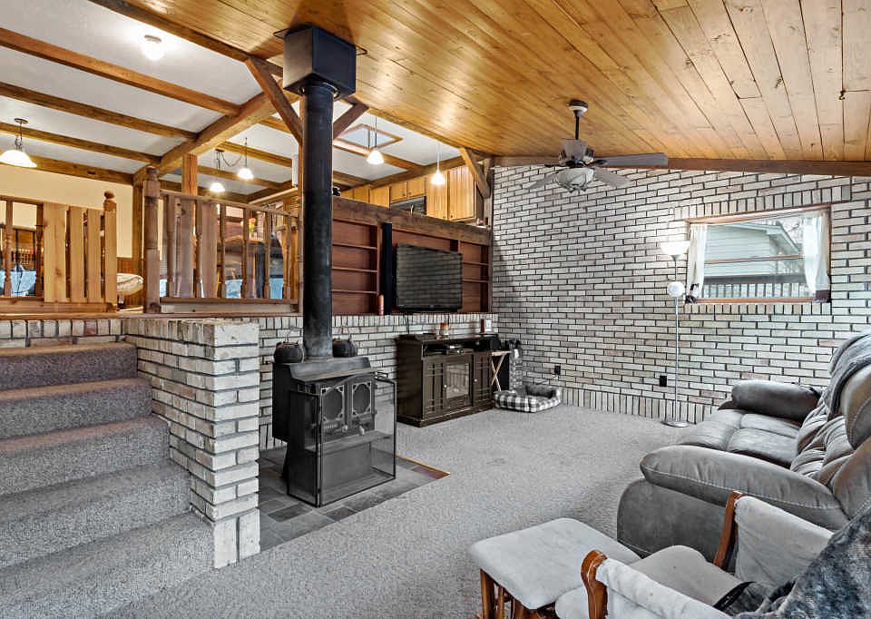 Rare find in this great location & price point! Multi level home features open concept kitchen with island & big dining area. Living room with vaulted wood ceilings, exposed brick walls, and wood burning stove. 34' X 26' huge metal, heated garage!! Over 1/3 acre deep lot with great views from double tiered deck. All appliances included, main level laundry and master bedroom. Spiral staircase leads to lower 2 bedrooms. 1 year home warranty included for your peace of mind.