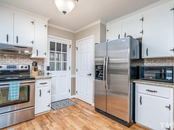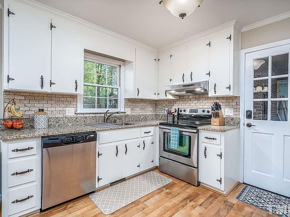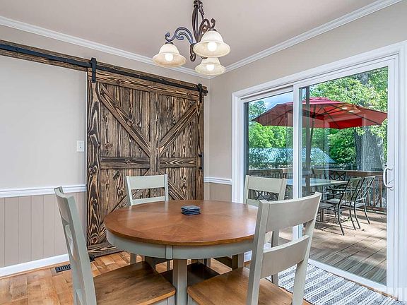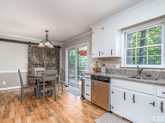 Walk to downtown Cary from this charming ranch home with a large fenced backyard & 1 car garage! Completely updated w/ laminate hardwood flooring throughout, beautiful wood trim throughout, family room w/ painted brick surround fireplace +wood beams & builtins, bright kitchen w/ white cabinets, granite, stainless appliances & subway tile backsplash. Beautiful barn door leading to the large laundry room, 3 additional bedrooms + updated 2 updated baths. Peaceful deck overlooking the large flat backyard.