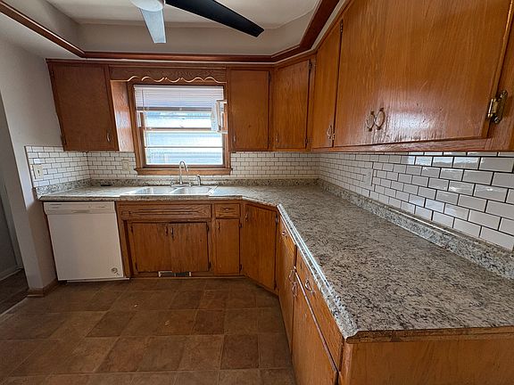 The kitchen includes a gas range, refrigerator/freezer, dishwasher, new ceiling fan and updated backsplash tile. There is an eat-in area and the kitchen opens to a large living room with great light and hardwood floors.