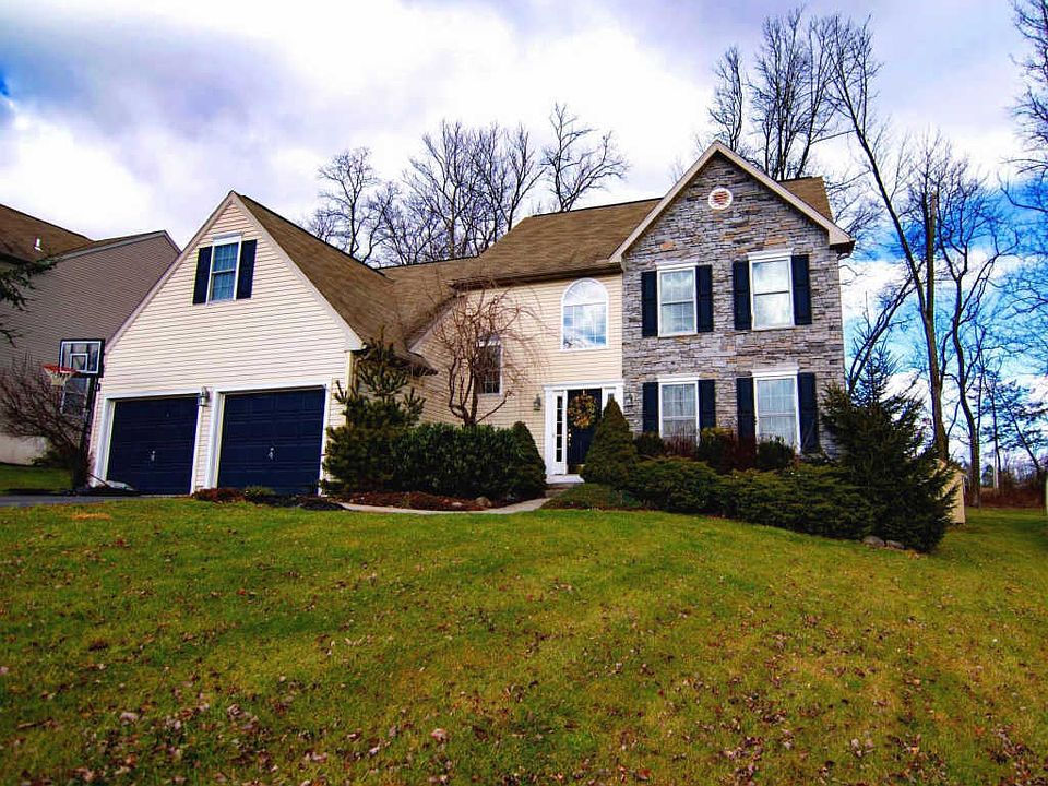 Welcome home to this beautiful 4 bedroom, 2.5 bath home with lots of natural light in the Greenbriar development. Enter through the inviting front door to a vaulted entry way with hardwood flooring. Carpeted formal living room and tandem formal dining room with hard wood flooring and chair rail. Eat in kitchen with cherry cabinetry and counter island leads to the massive family room with beautiful stone fireplace, vaulted ceiling with recessed lights and ceiling fan. Natural stone 'custom' knee wall can be used as desk area and/or breakfast bar and separates the family room from the kitchen. Upstairs you will find the Master bedroom with ensuite master bath and two spacious closets. Master bath has soaking tub, double bowl vanity and stand up shower. Ceiling fan in Master bedroom. 3 additional bedrooms and hall bath on this level - there is a BONUS ROOM room on this level that can be used as playroom and/or 5th bedroom. Partially finished basement with plenty of storage and outside entrance. Sliding glass door from the kitchen leada to paved patio with stone firepit and nice sized yard for summertime entertaining. Easy access to Route 422, this beautiful home is only 30 minutes from King of Prussia Mall and 15 minutes Philadelphia Premium Outlets. A WONDERFUL place to call HOME! For peace of mind a Home Warranty is offered.