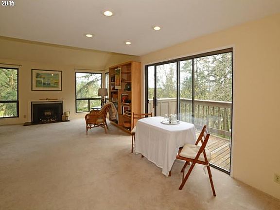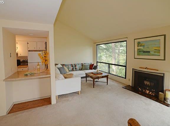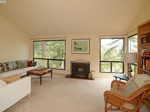 Private very end, street level unit condo with nothing but tranquil forest views. No stairs. Spacious living room with vaulted ceiling, lots of windows & wood burning fireplace. Dining room has slider opening to a private deck which receives morning sun. Sale includes a large garage right across the driveway from the home. Common facilities include pool, fitness center, sauna, kitchen, barbecue.