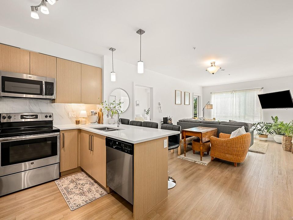 Open concept floor planStylish kitchenStainless steel appliancesPlenty of cabinet spaceGenerous south-facing patioSpacious primary bedroomWalk-through closet