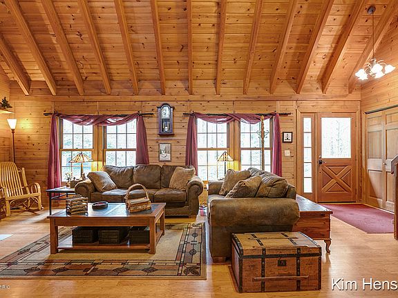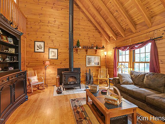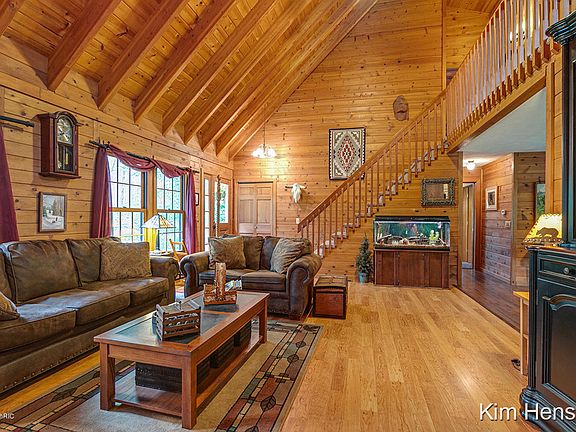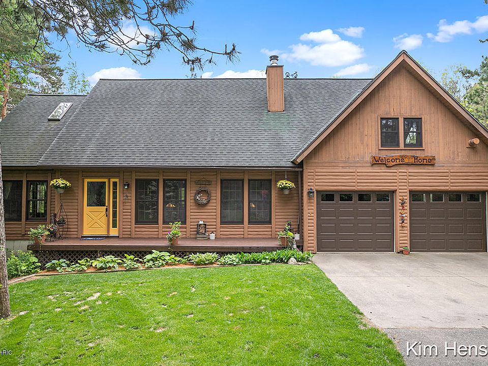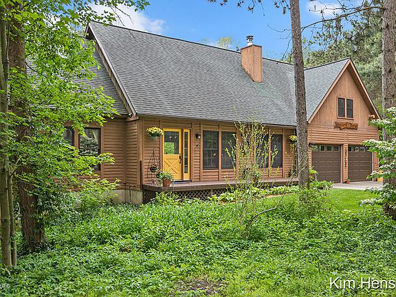 Beautiful log cabin style home nestled away on over an acre of land in prime Rockford location, featuring pristine landscaping, mature trees and serene privacy. This home features a welcoming open floor plan with soaring ceilings upon entering the great room with natural wood burning fireplace, open upper balcony and natural flow into your dine in kitchen. Enjoy cooking in your kitchen featuring a center island perfect for entertaining and plenty of storage space with your pantry, mudroom and 1/2 bath access. Your kitchen and dining area also includes views of your private outdoors and leads to your spacious screened in 3 season porch offering a great space to enjoy dining, friends or a book. The main floor also offers your laundry and large bedroom with ensuite.