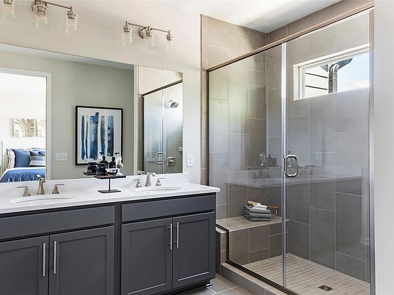 Upstairs, there are three bedrooms, including the primary suite, featuring an upgraded shower with tile walls, tile pan, and seat, and a spacious primary walk-in closet. Across from the primary suite is the laundry room and an upgraded second full bathroom, featuring an additional sink and tub surround.