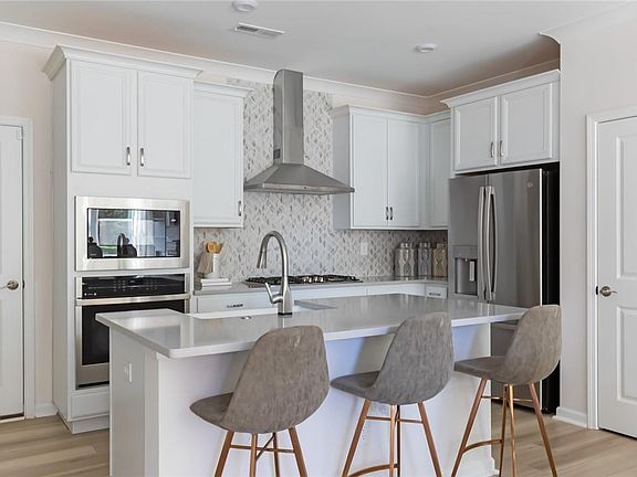 The kitchen has the gourmet upgrade, presenting a 36" gas cooktop, elevated stainless steel appliances, crisp white cabinets, white backsplash tile, all tied together by the stunning Kensho quartz counter tops. The great room and dining room flow seamlessly into one another, complimented perfectly by the lovely front courtyard.