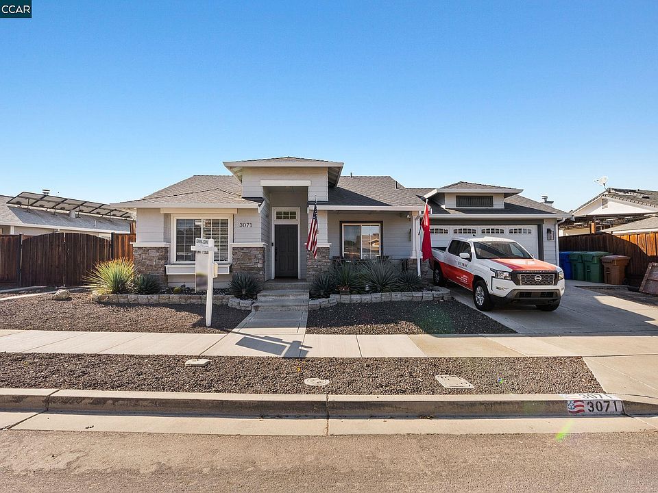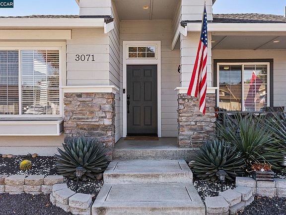 Fabulous single story with remodeled kitchen and baths! Enter and enjoy the upgraded laminate wood flooring in the entry, living room, dining area and kitchen. Nice cozy fireplace, newly upgraded and updated kitchen with stainless appliances, white cabinets, quartz counters and center island with breakfast bar. 2 larger, secondary bedrooms share the hall closet that has been updated as well. Primary bedroom has slider to yard and a beautiful updated bath with custom shower, dual vanity and barn door for privacy. Large, double gated and paved side access, new interior paint, BIG backyard with patio area, large gazebo and dog run. Roof is 3 years new with Solar, 2 car attached garage, no HOA and is turn key!