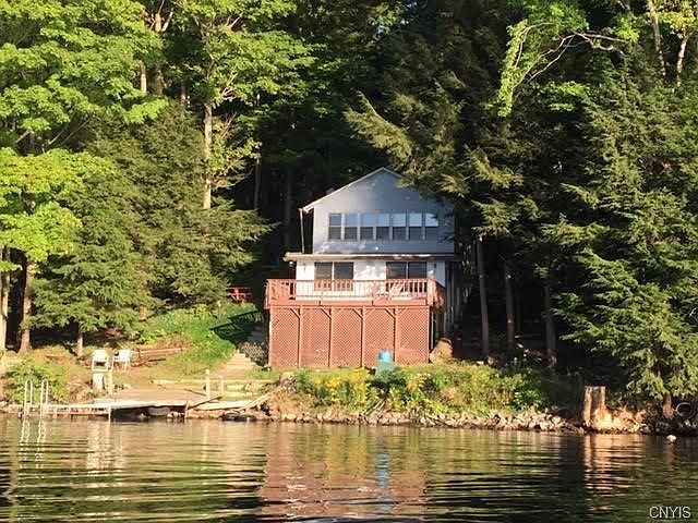 Outstanding setting on the shores of Tuscarora Lake! Over 100' of privacy, sunsets and shoreline! Owned by one family from 1949 to 2018. Needs renovation or perhaps removed and build your dream home here! Large footprint for new home. Updated stove and refrigerator, 2 outdoor woodburning firepits, driveway has easement for home next door, see survey. Dock stays with property. A true "camp" with a million dollar setting!!